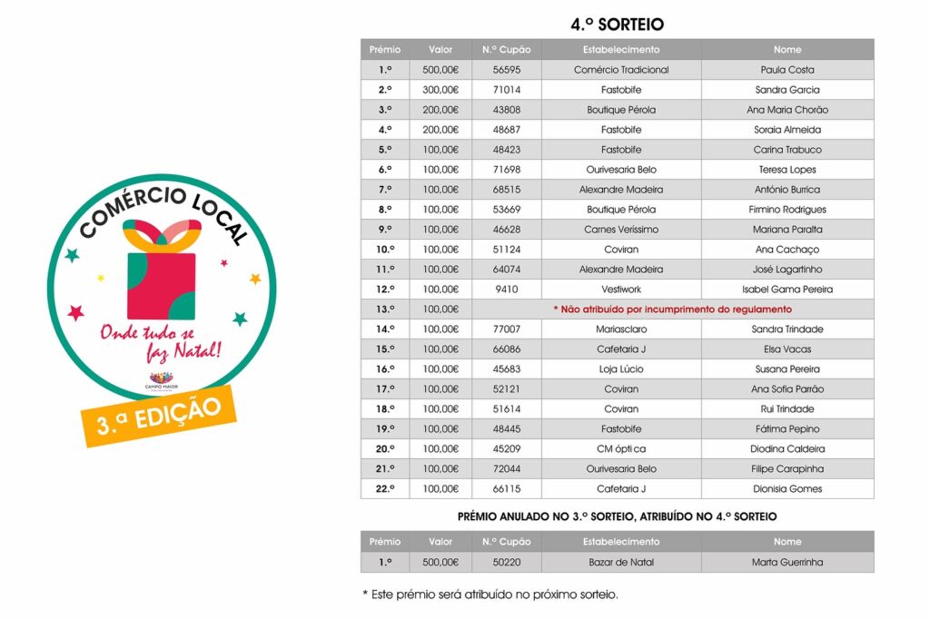A lista dos premiados foi tornada pública, devendo os contemplados levantar os seus prémios a partir de quinta-feira, dia 2 de janeiro, no Centro Cultural de Campo Maior.