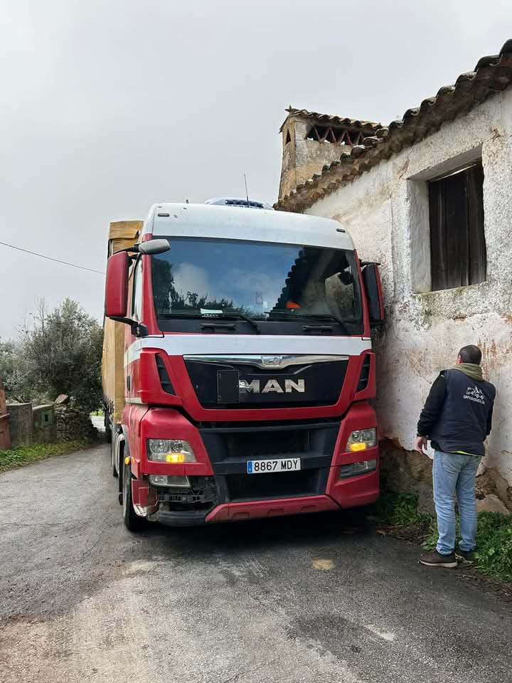 O veículo longo de transporte de garrafões de plástico para reciclagem, que haviam sido carregados numa cooperativa do sector da olivicultura da região, dirigia-se para Cáceres e acabou por ficar preso na Azinhaga da Água da Prata.
