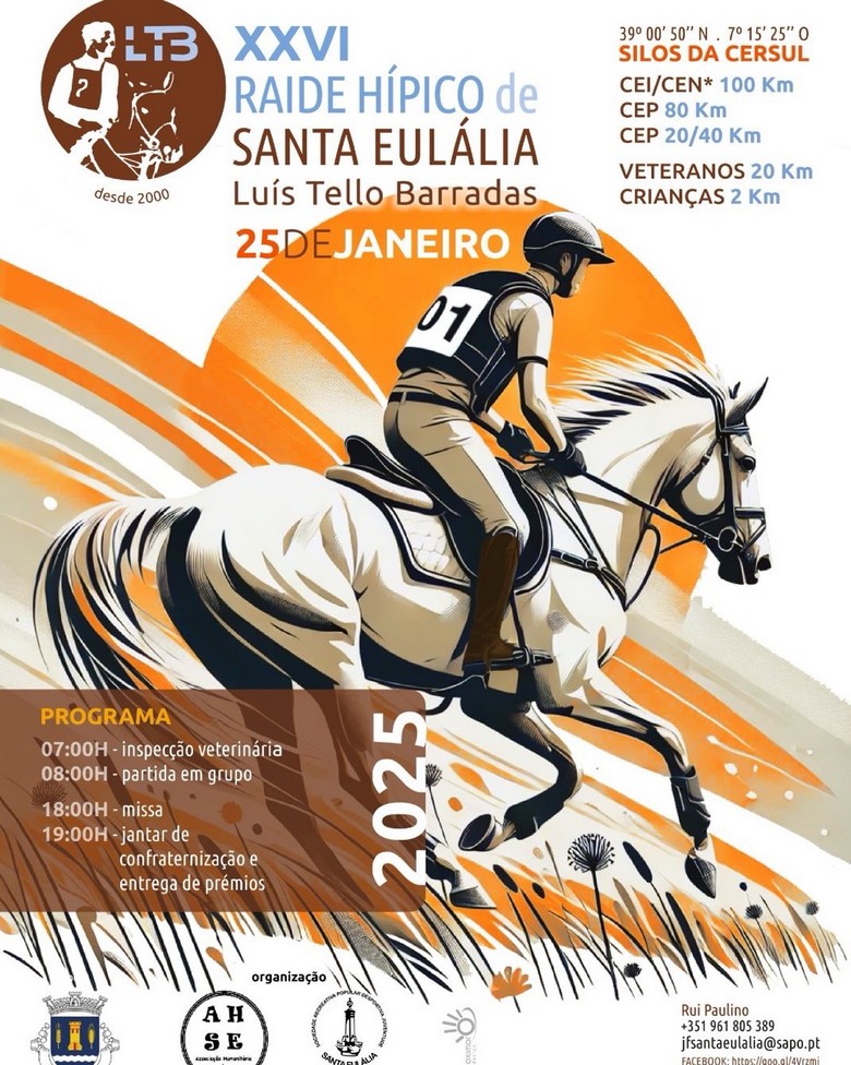 O Raide Hípico de Santa Eulália “Luís Tello Barradas”, prova organizada pela Associação Humanitária local e pela Secção de Veteranos da Sociedade Recreativa Popular e Desportiva, realiza-se este sábado, dia 25 de Janeiro.