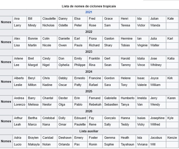 Nomes dos ciclones tropicais de 2021 a 2026