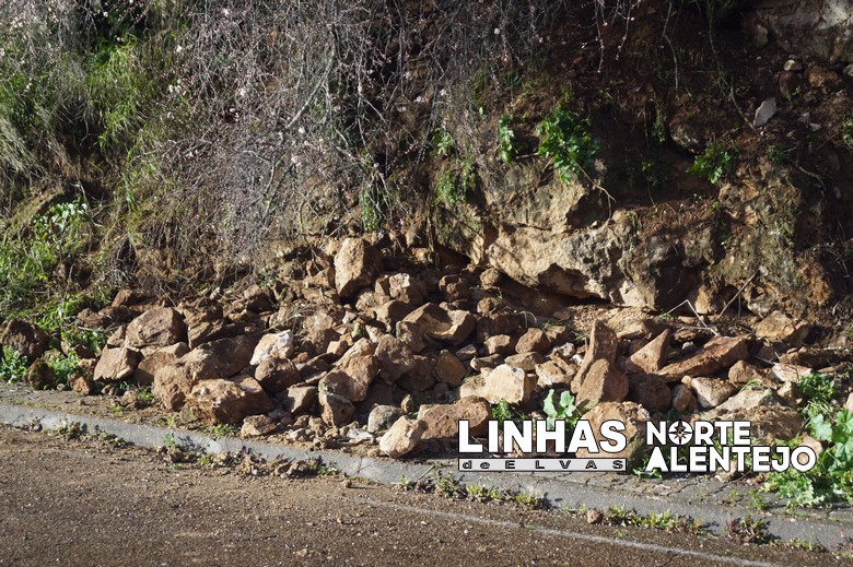 O mau tempo que se faz sentir na região esteve na origem de uma queda de pedras na Antiga Estrada Nacional 4 , junto ao Continente, em Elvas.