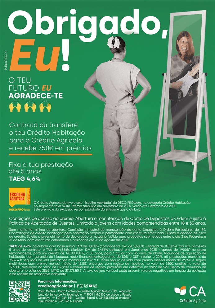 O Crédito Agrícola acaba de lançar a iniciativa “Obrigado, Eu!”, direccionada a jovens entre os 18 e os 35 anos que pretendem contratar ou transferir o seu Crédito Habitação para o Crédito Agrícola, com o objetivo de os capacitar nesta nova fase da vida e os ajudar a concretizar o sonho de comprar finalmente a sua própria casa.