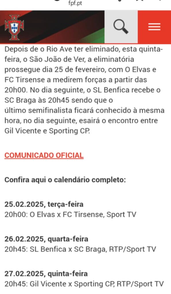 Depois de o Rio Ave ter eliminado, esta quinta-feira, o São João de Ver, a eliminatória prossegue dia 25 de fevereiro, com O Elvas e FC Tirsense a medirem forças a partir das 20h00. No dia seguinte, 26, o SL Benfica recebe o SC Braga às 20h45 sendo que o último semifinalista ficará conhecido à mesma hora, no dia seguinte, DIA 27, e sairá do encontro entre Gil Vicente e Sporting CP. “
