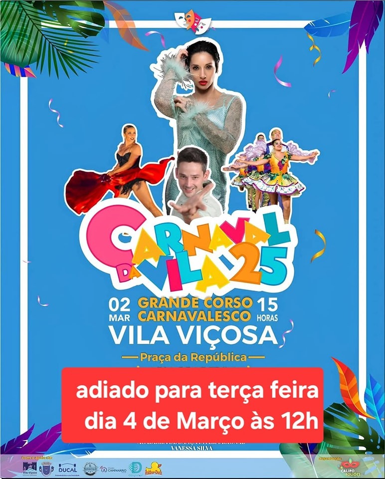O Corso Carnavalesco de Vila Viçosa foi reagendado. Inicialmente marcado para amanhã, domingo, 2 de Março, transita para Terça-feira de Carnaval, dia 4.