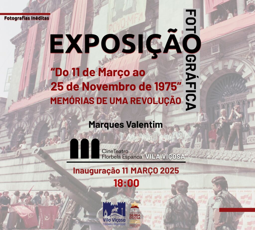 A Galeria de Arte do Cineteatro Florbela Espanca, em Vila Viçosa, será palco da inauguração da exposição fotográfica “Do 11 de Março ao 25 de Novembro de 1975 – Fotografias com História”, da autoria de Marques Valentim.