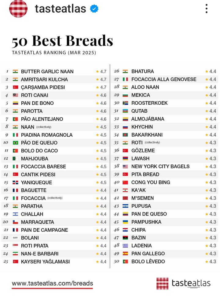 A lista é liderada pelo pão indiano butter garlic naan. Segue-se o amritsari kulcha, também da Índia, e o turco çarsamba pidesi a fechar o pódio.