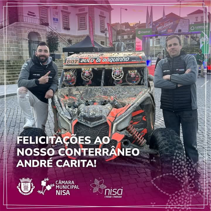 A Câmara Municipal de Nisa publicou nas redes sociais uma mensagem de “felicitações ao nosso conterrâneo André Carita e ao colega de equipa, Nuno Abrantes, pela vitória na Baja TT Escuderia Castelo Branco 2025, bem como pela liderança do Campeonato Nacional de Todo-o-Terreno na categoria de SSV e pela liderança do Campeonato Europeu de Bajas na mesma categoria”.