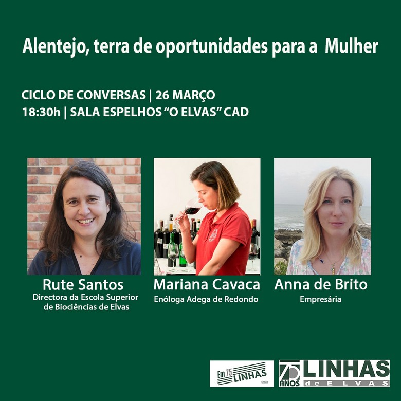Este segundo encontro, que terá lugar esta quarta-feira, dia 26 de Março, na sala dos espelhos de “O Elvas” Clube Alentejano de Desportos, pelas 18,30h, irá desenvolver-se em torno do tema “Alentejo, terra de oportunidades para a Mulher”, tendo como convidadas a directora da Escola Superior de Biociências de Elvas, Rute Santos, a enóloga Mariana Cavaca e a empresária Anna de Brito.