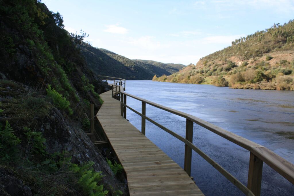 Parte do percurso é feito sobre os muros de sirga, estrutura construída que serviu para homens e animais puxarem os barcos rio acima, quando o Tejo era navegável, atravessando pontos difíceis tais como o cachão do Cabril.