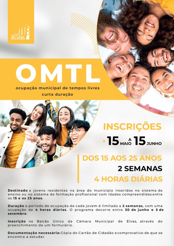 A Câmara Municipal de Elvas vai abrir amanhã, 15 de Maio, as inscrições para o programa de Ocupação Municipal de Tempos Livres (OMTL). Os jovens com idades entre 15 e 25 anos residentes no concelho que pretendam participar podem formalizar a candidatura até 15 de Junho.