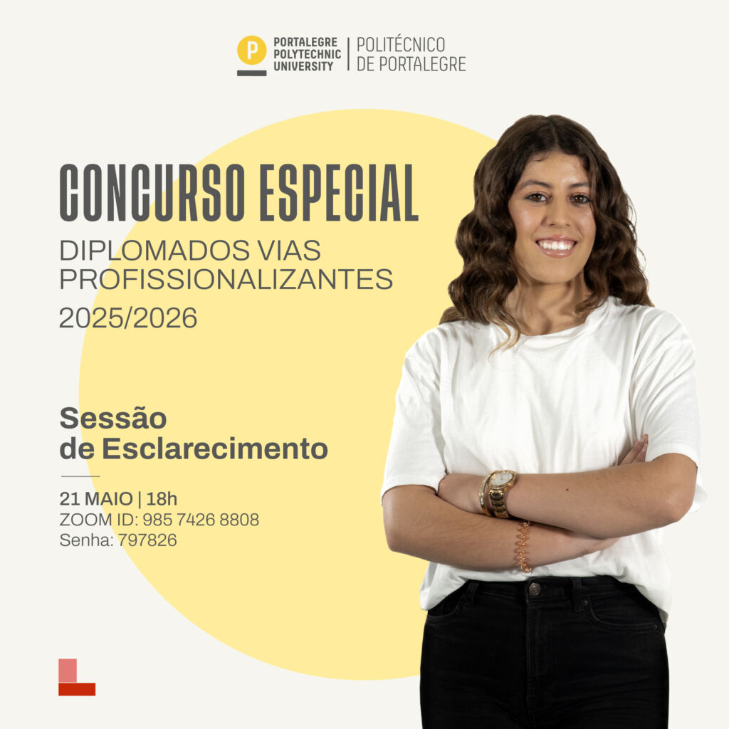 O Instituto Politécnico de Portalegre (IPP) vai promover no dia 21 de Maio, às 18 horas, uma sessão de esclarecimento online direcionada aos alunos dos  cursos de dupla certificação do ensino secundário (cursos profissionais) e cursos artísticos especializados. Com esta iniciativa o IPP pretende elucidar estes alunos sobre a forma de concorrer às licenciaturas através do Concurso Especial de ingresso no Ensino Superior para Diplomados das Vias Profissionalizantes. Esta opção  permite aos alunos destes cursos realizarem exames que incidem apenas sobre as matérias lecionadas nas disciplinas dos seus cursos.