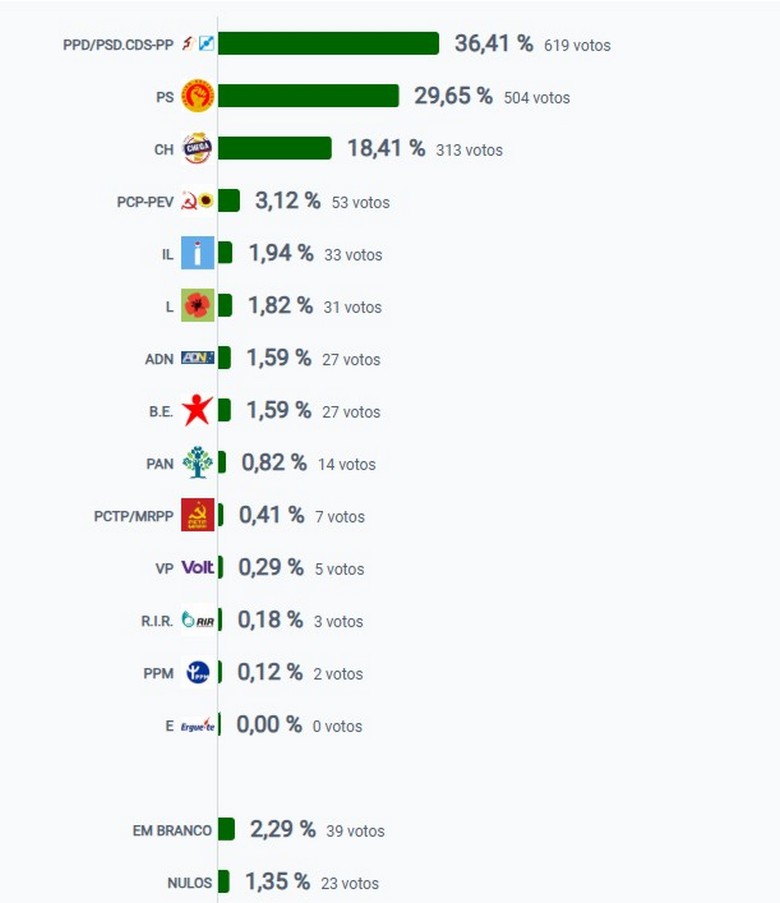 O PS ficou em segundo lugar com 29,65% e o Chega em terceiro conseguiu 18,41%.