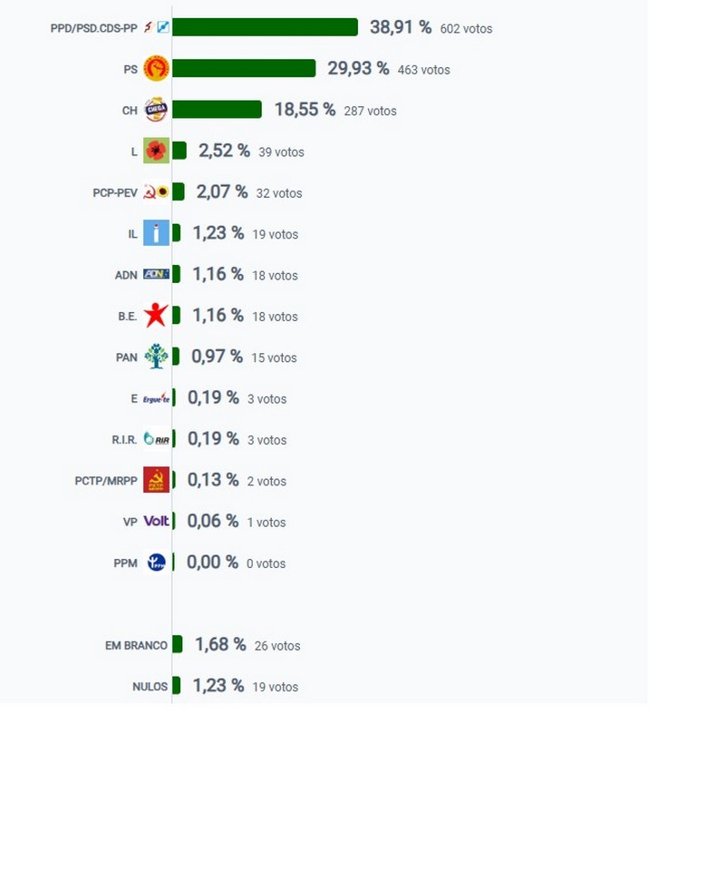 O Partido Socialista ficou em segundo lugar com 29,93% e o Chega em terceiro com 18,55%.