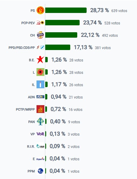 O Partido Comunista ficou em segundo lugar, com 23,74% dos votos. A terceira força política mais votada foi o Chega com 22,12% dos votos.