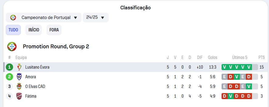 Com o triunfo de hoje e a derrota do Amora, “O Elvas” vê renascer a esperança de subir à Liga 3, embora os resultados obtidos até ao momento sejam mais favoráveis à equipa da margem sul, que tem os mesmos 5 pontos que o Elvas, mas menos golos sofridos.