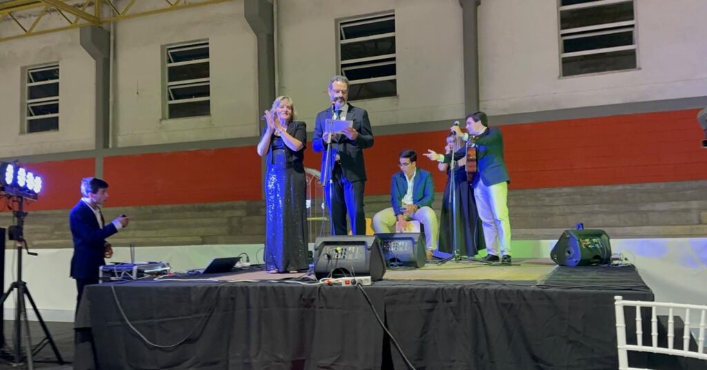 Seguiu-se o tradicional jantar de gala no Pavilhão Desportivo da Escola Secundária, transformado num salão de festa, onde finalistas, professores, familiares e amigos celebraram o momento marcante. O discurso do Diretor emocionou os presentes, com mensagens de coragem, autenticidade e esperança, inspiradas no poema Pedra Filosofal, de António Gedeão.