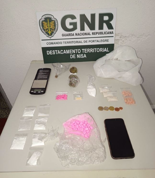 A GNR apreendeu 18 doses de haxixe, 6,28 doses de liamba, 2,03 gramas de anfetaminas, 1,3 gramas de cogumelos alucinogénios, 0,3 gramas de LSD e uma faca de corte.