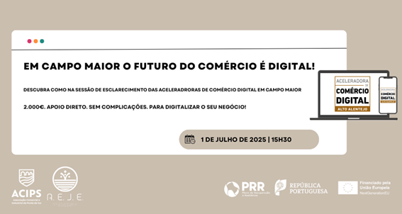 No próximo dia 1 de julho, pelas 15h30, terá lugar no Centro Interpretativo da Fortificação Abaluartada de Campo Maior uma sessão de apresentação e esclarecimento sobre o projeto Aceleradoras do Comércio Digital do Alto Alentejo, promovido pela ACIPS – Associação Comercial e Industrial de Ponte de Sor e financiado pelo Plano de Recuperação e Resiliência (PRR). Este projeto tem como objetivo apoiar a transformação digital do comércio tradicional no território do Alto Alentejo.