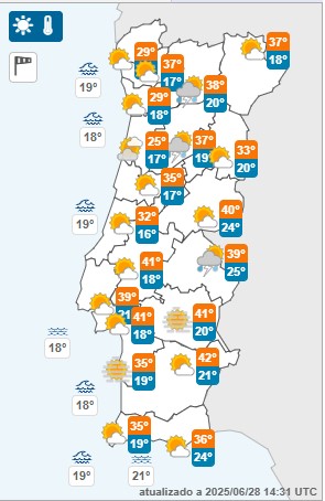 No continente, as previsões para hoje são de tempo quente e subida de temperatura, em especial da máxima que se prevê oscile entre os 43 graus Celsius, em Beja, e os 25, em Aveiro.
