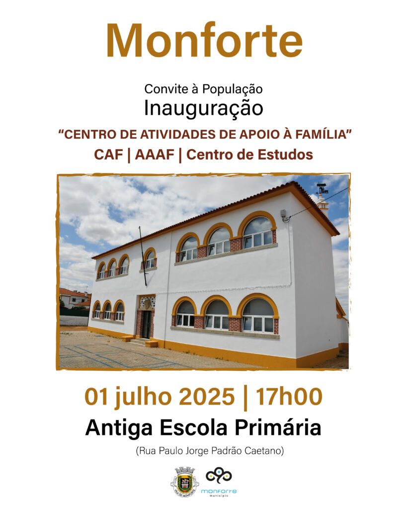 O Município de Monforte vai inaugurar, no próximo dia 1 de julho, pelas 17h00, o novo Centro de Atividades de Apoio à Família (CAF), localizado na antiga Escola Primária, na Rua Paulo Jorge Padrão Caetano.