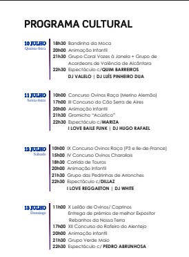 Nos dias seguintes sucedem-se várias atrações com destaque para concursos de ovinos, leilão de ovinos e caprinos, exibição dos melhores exemplares de cães das Raças Serra de Aires e Rafeiro do Alentejo e entrega de prémios de “Melhor Expositor Rebanhos da Nossa Terra”.