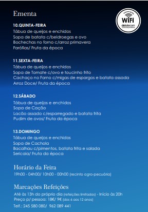 Nesta  tarde/noite de estreia há animação para os mais novos às 20h00, a anteceder um momento  etnográfico luso-espanhol, às 21h30, com  atuação partilhada entre o Grupo Coral “Vozes à Janela” e o Grupo de Acordeons de Valência de Alcântara. O momento mais aguardado é o espetáculo de Quim Barreiros, às 22h30. Quando terminar, tomam conta da noite os DJs Valelo e Luís Pinheiro.