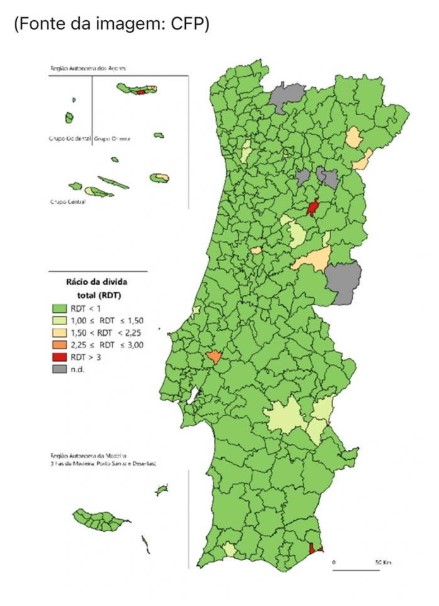O gráfico com a silhueta de Portugal preenchida com um mosaico onde constam todos os municípios do país, apresenta o verde como cor dominante. É esta a tonalidade que todas as câmaras municipais ambicionam, por ser a que representa a melhor saúde financeira dos municípios.