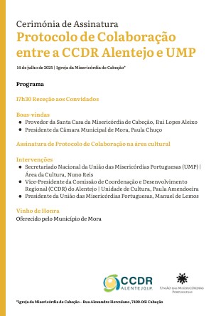 A Comissão de Coordenação e Desenvolvimento Regional (CCDR) do Alentejo e a União das Misericórdias Portuguesas (UMP) vão assinar na próxima segunda-feira, dia 14 de julho um protocolo de colaboração que visa reforçar a valorização, conservação e dinamização do património cultural das Santas Casas da Misericórdia da região.