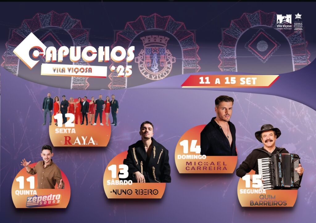 Zé Pedro Sousa, RAYA, Nuno Ribeiro, Mickael Carreira e Quim Barreiros integram o cartaz musical da Festa dos Capuchos, que vai decorrer em Vila Viçosa, distrito de Évora, de 11 a 15 de setembro, revelou a câmara municipal.