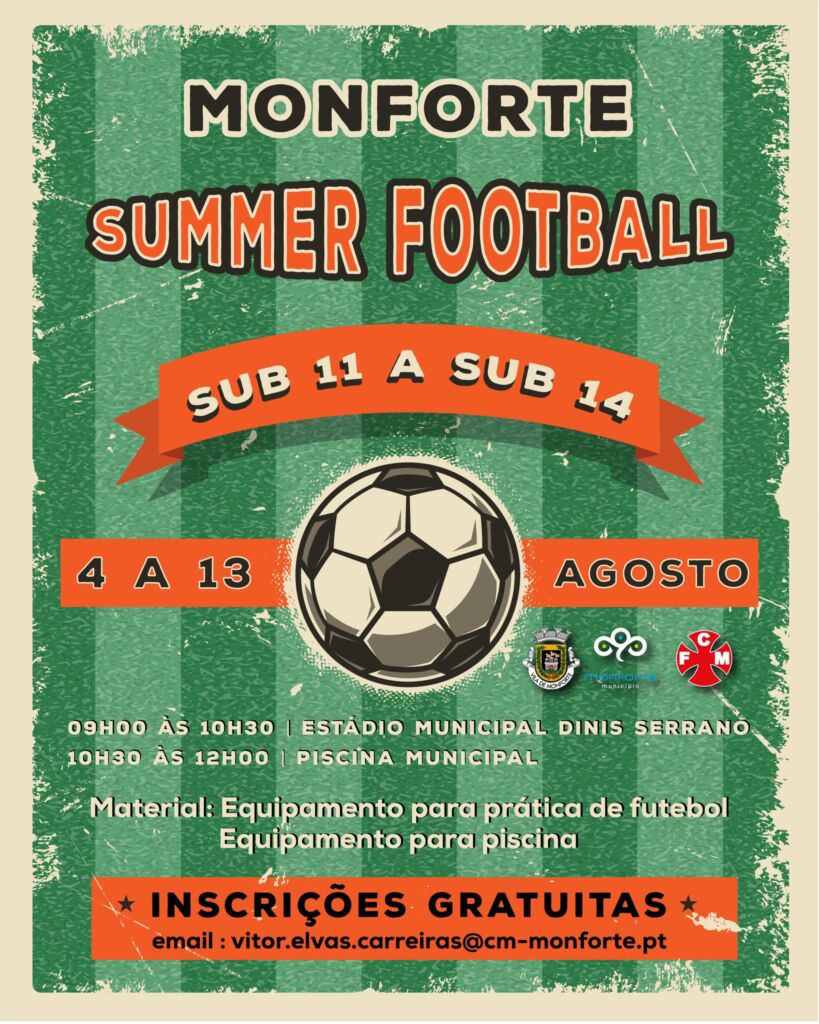 O Município de Monforte promove, de 4 a 13 de Agosto, o Monforte Summer Football, uma iniciativa gratuita dirigida a jovens dos escalões Sub-11 a Sub-14, com o objetivo de fomentar a prática desportiva e hábitos de vida saudáveis.