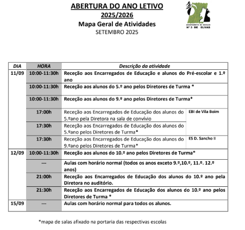 O Agrupamento de Escolas N.º 3 de Elvas prepara-se para abrir oficialmente o ano letivo 2025/2026 com um conjunto de atividades de receção destinadas a alunos e encarregados de educação.