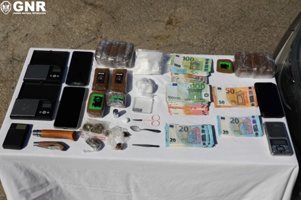 2 612 doses de resina de canábis; 405 doses de cocaína; Quatro doses de canábis; 3 285 euros em numerário e uma viatura.