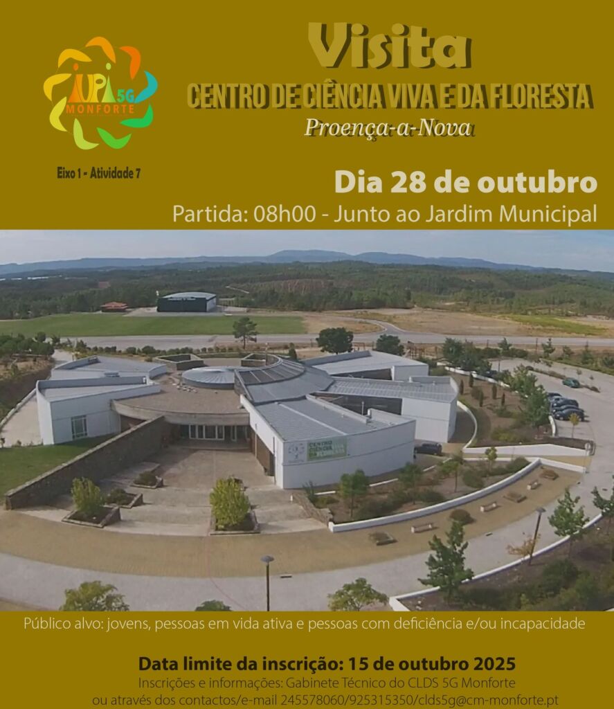 No âmbito do Eixo 1 – Emprego, Formação e Qualificação, integrado na Atividade 7 – CRIAR & INOVAR 5G, a Operação IUPI 5G MONFORTE do qual o Município de Monforte é a ECLP vai realizar, no próximo dia 28 de outubro, uma visita ao Centro Ciência Viva da Floresta, em Proença-a-Nova.