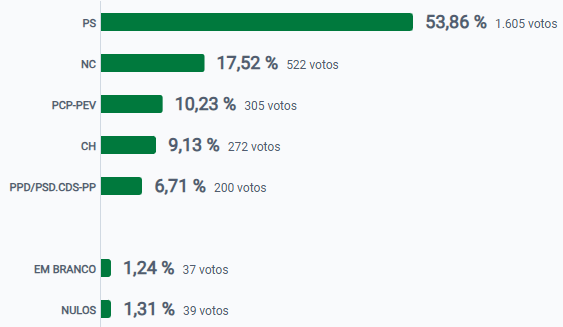 Depois do PS, com 53,86% dos votos, o segundo mais votado é o NC, com 17,52%, e o terceiro é o PCP-PEV, com 10,23%.