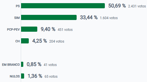 Depois do PS, com 50,69% dos votos, o segundo mais votado é o SIM, com 33,44%, e o terceiro é o PCP-PEV, com 9,40%.