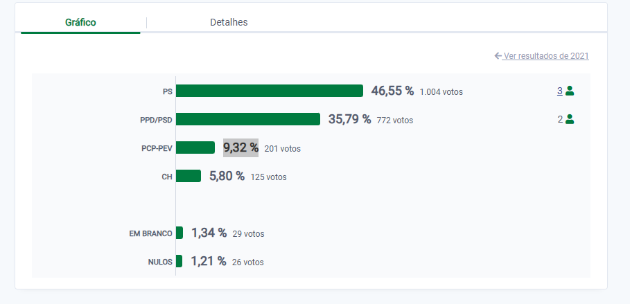 Seguiram-se, como forças partidárias mais votadas, PPD/PSD, com 35,79 %, e o PCP-PEV, com 9,32 %.