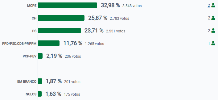 Rondão Almeida foi assim reeleito presidente da Câmara Municipal. Depois do MCPE, com 32,98% dos votos, o segundo mais votado é o Chega, com 25,87%, e o terceiro é o PS, com 23,71%.