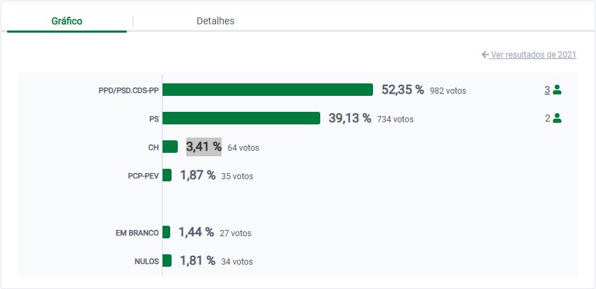 Seguiram-se, como forças partidárias mais votadas, o PS, com 39,13 %, e o CHEGA, com 3,41%
