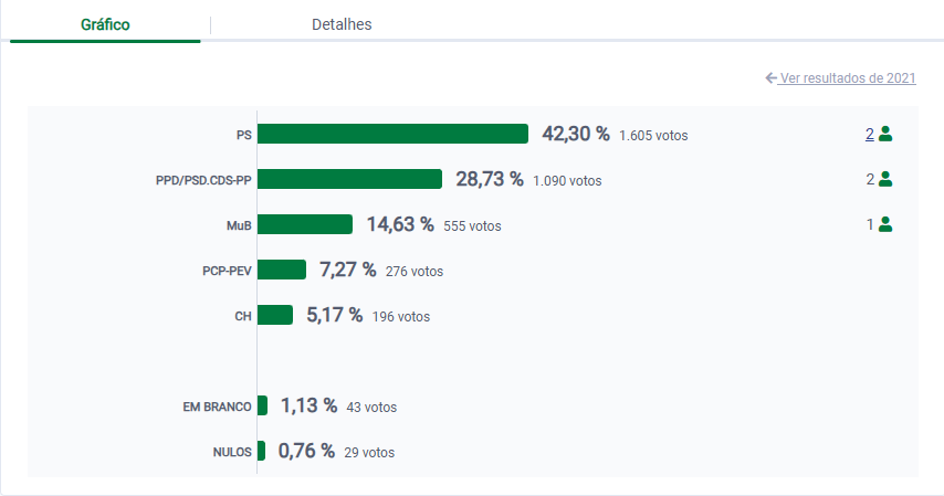 Depois de apurados os resultados nas quatro freguesias daquele concelho, o PS ficou à frente com 42,30% e dois mandatos, seguido pela coligação PSD/CDS-PP, com 28,73% e dois mandatos também.