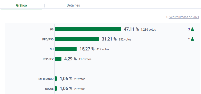 Seguiram-se, como forças partidárias mais votadas, o PPD/PSD, com 31,21%%, e o CHEGA, com 15,27%.