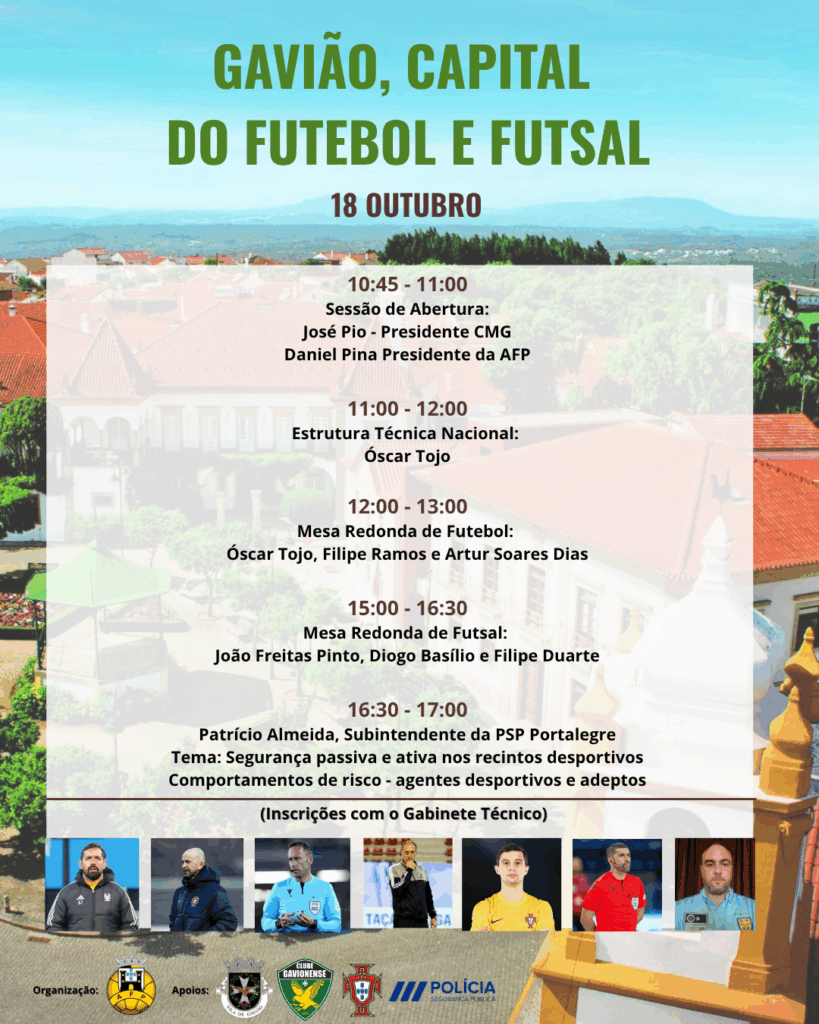No próximo dia 18 de outubro, o município de Gavião será palco de um evento de desporto de âmbito nacional: “Gavião, Capital do Futebol e Futsal”, com um Colóquio “Entre o Golo e o Apito”, uma iniciativa promovida pela Associação de Futebol de Portalegre com o apoio do Clube Gavionense e da Câmara Municipal de Gavião.