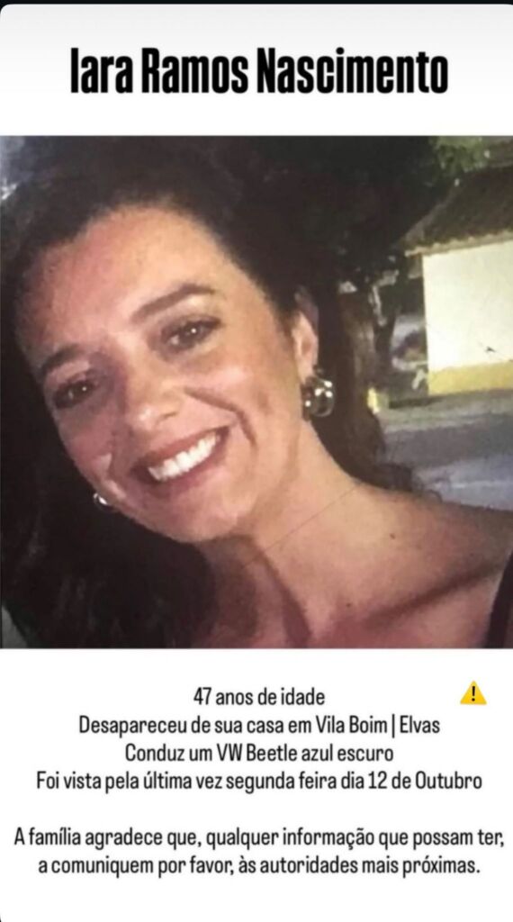 A comunidade do concelho de Elvas está mobilizada após o desaparecimento de Iara Ramos Nascimento, de 47 anos, que foi vista pela última vez no domingo, dia 12 de Outubro.
