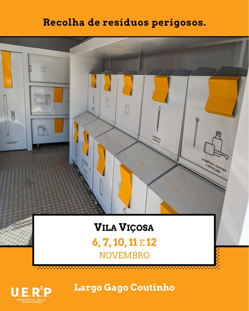 A Unidade Especial de Recolha de Resíduos Perigosos (UER2P) vai estar novamente em Vila Viçosa nos dias 6, 7, 10, 11 e 12 de Novembro de 2025, no Largo Gago Coutinho, junto ao Memorial de Homenagem aos Soldados Ingleses.