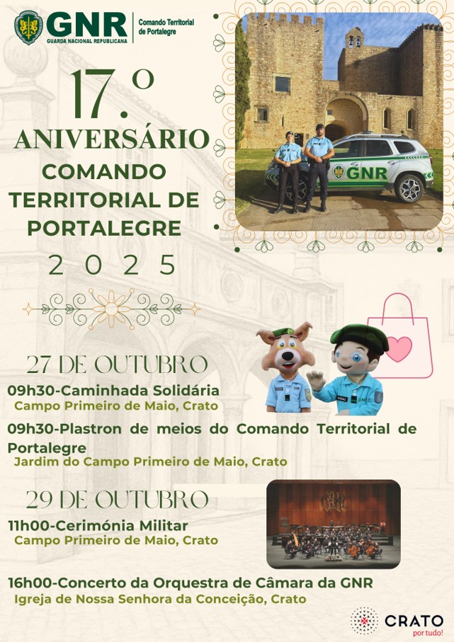As comemorações do 17.º aniversário do Comando Territorial de Portalegre da GNR vão realizar-se no concelho de Crato, arrancando na segunda-feira, com uma caminhada solidária,  às 09:30, divulgou a força de segurança.