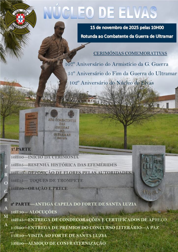 O Núcleo de Elvas da Liga dos Combatentes vai realizar, no dia 15 de novembro de 2025 (sábado), às 10h00, as cerimónias comemorativas do 107.º aniversário da assinatura do Armistício, do 51.º aniversário do fim da Guerra do Ultramar e do 102.º aniversário da fundação do Núcleo de Elvas da Liga dos Combatentes.
