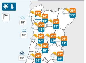 Na segunda-feira, prevê-se chuva ligeira e dispersa no Norte e Centro, especialmente nos distritos de Porto, Braga, Vila Real, Aveiro e Viseu, enquanto o Sul deverá manter-se seco, embora com céu mais nublado. As temperaturas máximas rondarão os 20 °C no litoral Sul e os 17–18 °C no Norte, com mínimas a descerem até aos 8–10 °C nas zonas interiores.