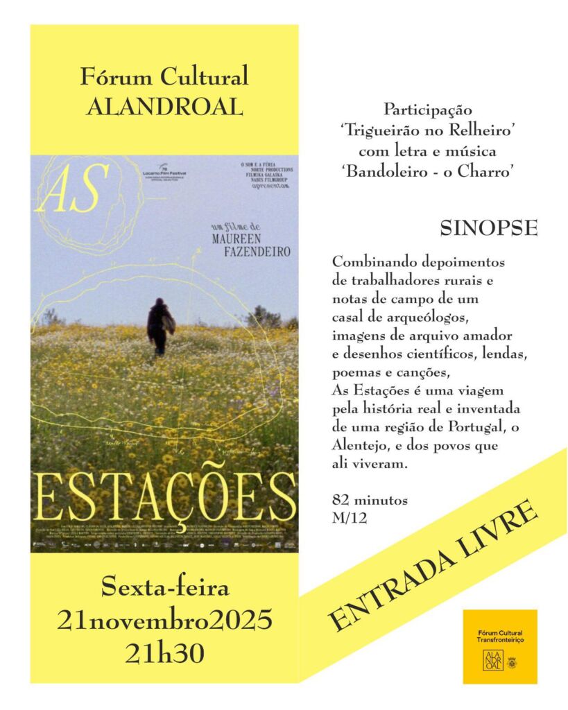 O Fórum Cultural de Alandroal recebe, na sexta-feira, 21 de novembro de 2025, pelas 21h30, a exibição do filme As Estações, da realizadora Maureen Fazendeiro. A sessão será de entrada livre e integra a programação cultural promovida pelo Fórum Cultural Transfronteiriço.