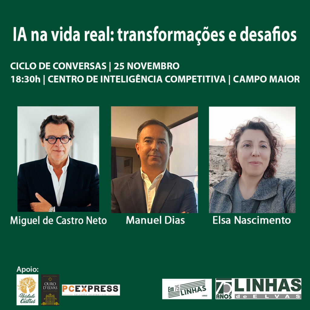 Desta feita, o tema será “IA na vida real: transformações e desafios” e terá como convidados Miguel de Castro Neto (director da NOVA Information Management School), Manuel Dias (director de Sistemas e Tecnologias de Informação da Administração Pública) e Elsa Nascimento (professora de Biologia e Geologia).