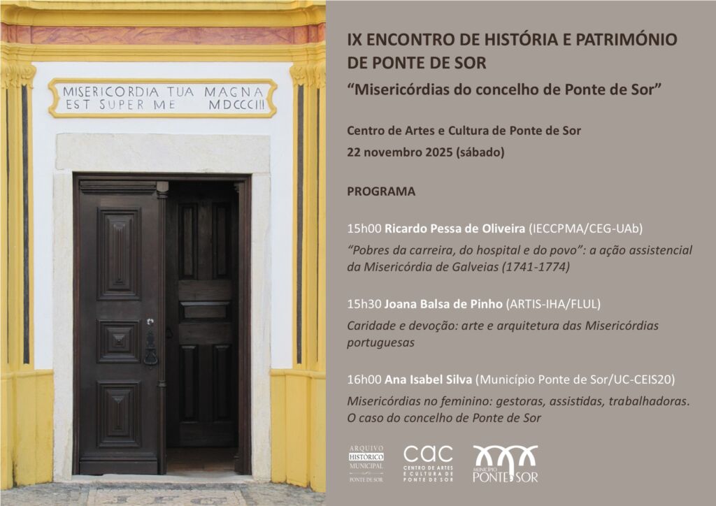 O Centro de Artes e Cultura de Ponte de Sor recebe, no próximo dia 22 de Novembro, o IX Encontro de História e Património de Ponte de Sor, este ano subordinado ao tema “Misericórdias do concelho de Ponte de Sor”.