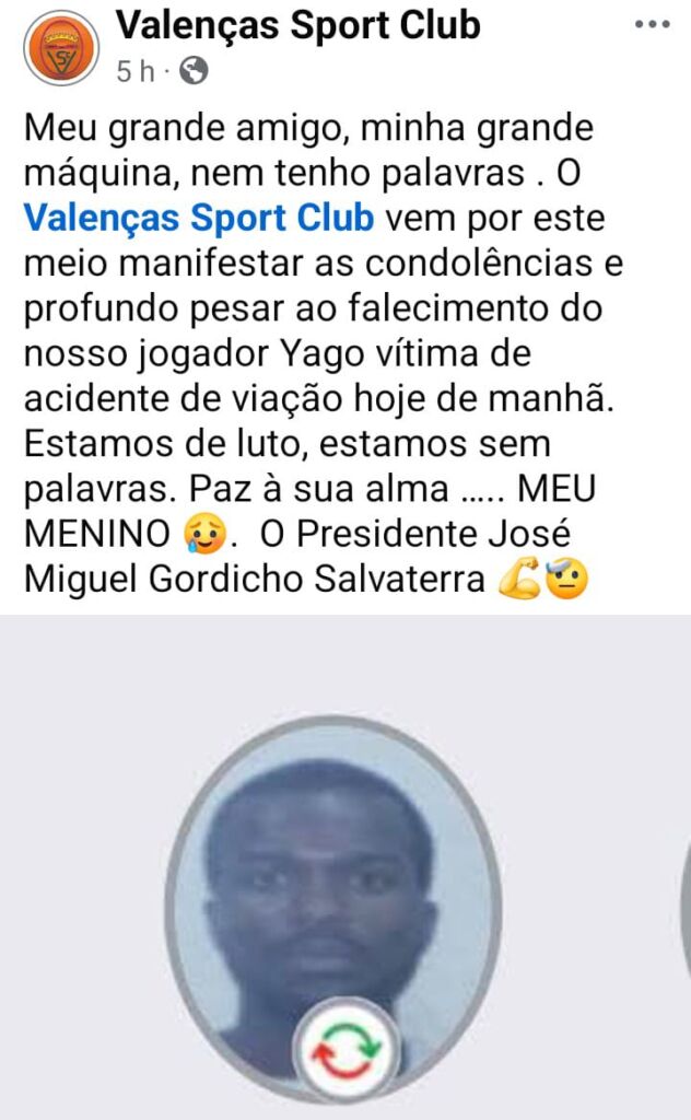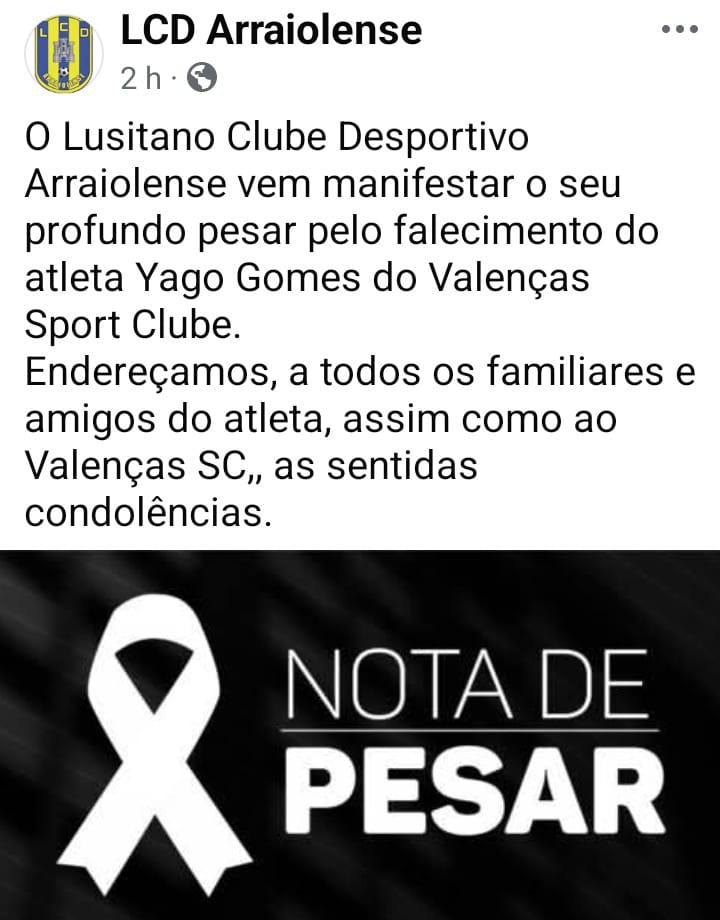 “Meu grande amigo, minha grande máquina, nem tenho palavras . O Valenças Sport Club vem por este meio manifestar as condolências e profundo pesar ao falecimento do nosso jogador Yago vítima de acidente de viação hoje de manhã. Estamos de luto, estamos sem palavras. Paz à sua alma ….. MEU MENINO”, escreveu José Miguel Gordicho Salvaterra, presidente da formação de Ciborro. O Lusitano Clube Desportivo Arraiolense também já manifestou o “profundo pesar pelo falecimento do Yago: “A todos os familiares e amigos, assim como ao Valenças SC, as sentidas condolências”.
